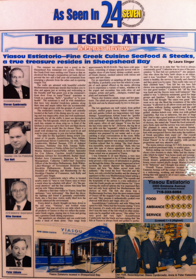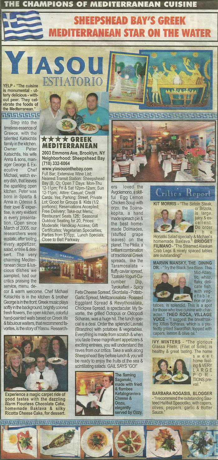 The elegant eatery, right on the Emmons Avenue waterfront, beckons hungry diners with the promise of freshly grilled fish, steaks and chops, as well as bevy of mouth-watering Greek specialties - all served up in an idyllic setting that is relaxed yet refined.