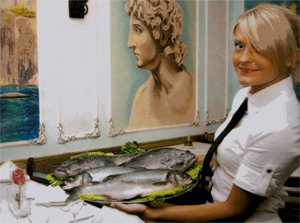 Insist that the old man accompany you to the iced display and show you his stuff....The branzino ($20 per pound, one pound average) is the best deal of all, black-striped from the grill, with gobbets of smoky flesh easily pulling away from the largish bones...Gleaming blue and silver, these beautiful sardines were big and sweet-fleshed. And cheap, too: At $20 for eight (representing one pound), they easily satisfied our crew of four.